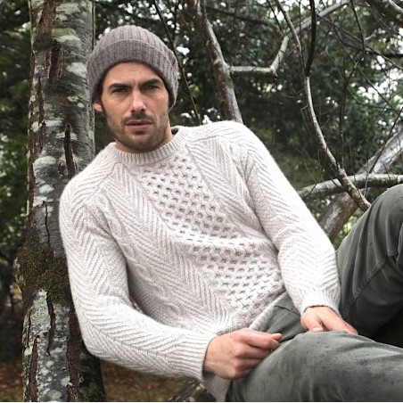 Einen legendären Aran-Pullover sollte jeder besitzen, der das Meer liebt. Dieser besondere ARAN hat ein leicht asymmetrisches Zopf- und Rautenmuster und ist aus reiner Geelong-Schurwolle gefertigt. Das ist Wolle der ersten Schur und somit besonders weich.